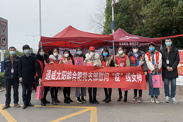 在防疫阻擊戰(zhàn)的關(guān)鍵時(shí)刻,如果說(shuō)醫(yī)務(wù)人員上“火線”,環(huán)衛(wèi)工人上“一線”,那社區(qū)工作者就是守護(hù)好居民生命安全的“最后一道防線”。3月6日上午,通威太陽(yáng)能合肥公司職工志愿者來(lái)到復(fù)興社區(qū)為堅(jiān)守崗位的一線女工送上了鮮花與節(jié)日禮品,并對(duì)她們?cè)谝咔槠陂g做出的奉獻(xiàn)表達(dá)敬意與問(wèn)候,復(fù)興社區(qū)的工作人員對(duì)公司的愛(ài)心舉動(dòng)表示感謝。