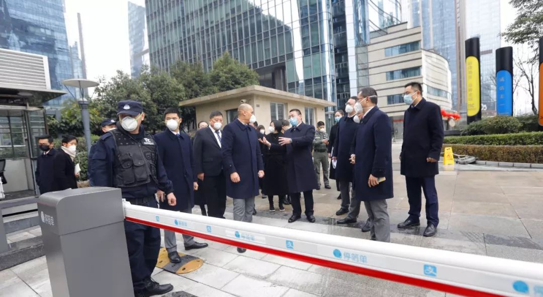 為貫徹落實主席指示,集團行政后勤體系聞風而動,立即執行。當天下午,集團副總裁黃其剛帶領集團行政后勤體系管理團隊,實地檢查了通威國際中心東廣場大門、停車場、電梯間、餐廳等關鍵場地,詳細了解體溫測量、物資儲備、內外消殺、值班人員安排等具體情況和工作細節。