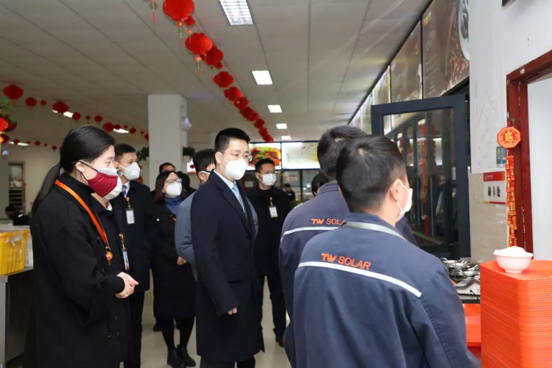 謝毅董事長(zhǎng)先后察看了通威太陽能成都公司門崗、生產(chǎn)車間、食堂、廠務(wù)中控室等區(qū)域,每到一處都詳細(xì)詢問員工防護(hù)措施、公共區(qū)域消毒落實(shí)、防護(hù)用品保障等相關(guān)工作開展情況,詳細(xì)了解員工值班情況及對(duì)公司防控措施的滿意情況等,并為辛苦奮戰(zhàn)在防疫一線的廣大員工送去節(jié)日的祝福與問候。謝董強(qiáng)調(diào),當(dāng)前是阻斷疫情蔓延擴(kuò)散的關(guān)鍵階段,容不得任何麻痹懈怠和僥幸心理,必須嚴(yán)把關(guān)口、嚴(yán)格執(zhí)行、嚴(yán)密防范,尤其是門崗要堅(jiān)決守好廠區(qū)安全“第一道關(guān)”。各體系部門要對(duì)標(biāo)政府相關(guān)部署安排,統(tǒng)一思想認(rèn)識(shí),提升防控水平,堅(jiān)持屬地管理和流程化管理,使各崗位員工尤其是防疫一線崗位員工的工作清單化,同時(shí)及時(shí)宣傳公司防疫措施、防護(hù)知識(shí)、疫情信息,做到疫情信息公開透明,大家不造謠、不信謠、不傳謠,全員重視、全員參與。