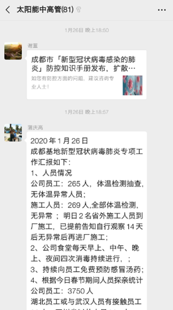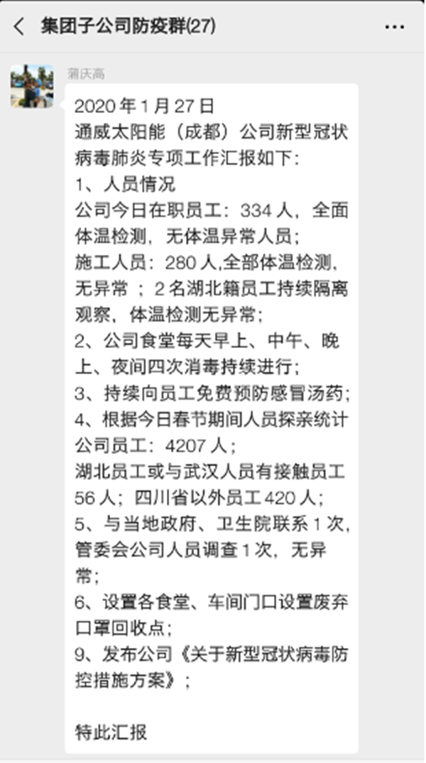 為防控新型冠狀病毒,保障員工健康安全,通威太陽能組織召開了春節假期新型冠狀病毒安全防范工作會議,成立應急防控小組,制定相應的疫情應急防控措施方案,并發布《通威太陽能春節期間新型冠狀病毒應急管理方案》。