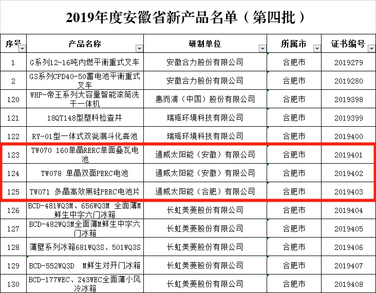 1月6日,安徽省經濟和信息化廳發布了“關于確認2019年安徽省新產品(第四批)的通知”,通威太陽能TW070 160單晶PERC單面疊瓦電池、TW078單晶雙面PERC電池、TW071多晶高效黑硅PERC電池片三項新產品榮列2019年度安徽省新產品名單(第四批)。