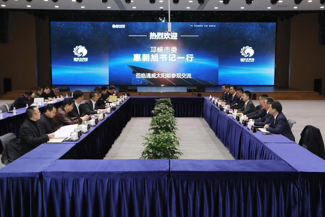 12月20日,邛崍市委書記惠朝旭一行蒞臨通威太陽能成都公司調研。邛崍市委副書記、市長王林,市委常委、天府新區新能源新材料產業功能區黨工委書記陳華,副市長、成甘園區管委會常務副主任趙波等領導陪同調研,通威股份董事長謝毅熱情接待并陪同座談。