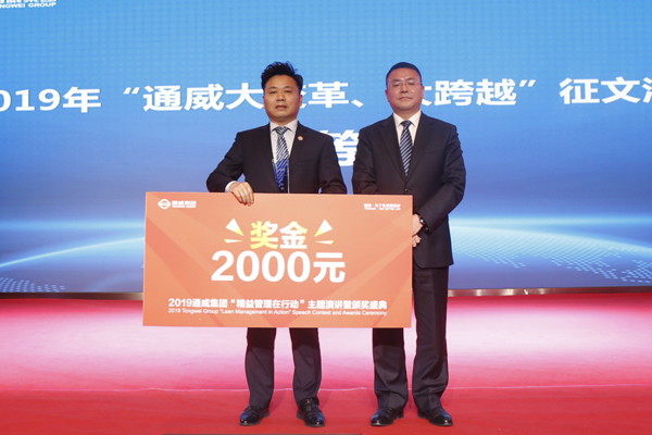 通威股份監事會主席鄧三為“精益管理在行動”主題演講一等獎獲得者永祥多晶硅潘爰原頒獎