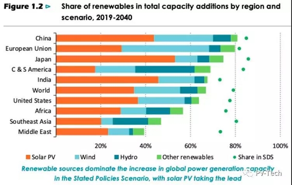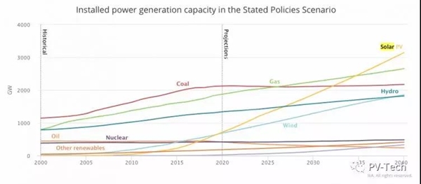 太陽能也在既定政策方案中勝出。至2040年,能源需求將以每年1%的速度增長,而以光伏為首的低碳能源在增長中的占比會達到一半以上。至2040年,太陽能光伏會成為全球最大的裝機量來源并會在21世紀30年代初超過煤炭。