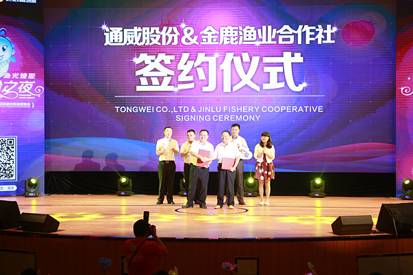 9月20日晚上9時30分,現(xiàn)場迎來又一輪高潮,通威股份與金鹿?jié)O業(yè)合作社現(xiàn)場舉行簽約儀式。通威股份郭異忠總裁、金鹿?jié)O業(yè)合作社理事長高李松上臺簽約。郭異忠總裁表示,很榮幸能夠與現(xiàn)代科技型農民專業(yè)合作經濟組織金鹿?jié)O業(yè)簽約,通威與金鹿?jié)O業(yè)之前就有合作,這次簽約標志著雙方合作更上一個臺階,為未來推進“漁光一體”項目鋪平道路,共謀發(fā)展。金鹿?jié)O業(yè)合作社高總則感慨表示,經過十年時間,終于加入通威,希望在通威的懷抱里繼續(xù)遠航。