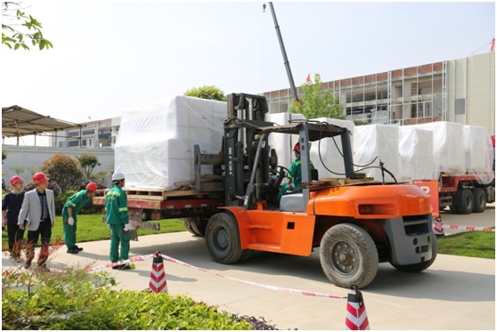 “現在103廠房環氧地坪還處于養護期,設備只能暫時性存放在露天廣場,為了100%保障設備安全,我們提前準備了彩條布,整體覆蓋設備,防雨防曬?!币贿吔o記者介紹,何堂貴一邊目不轉睛的盯著叉車裝卸。