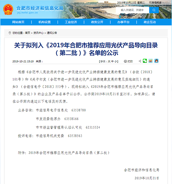 通威太陽能榮列《2019年合肥市推薦應用光伏產品導向目錄(第二批)》公示名單