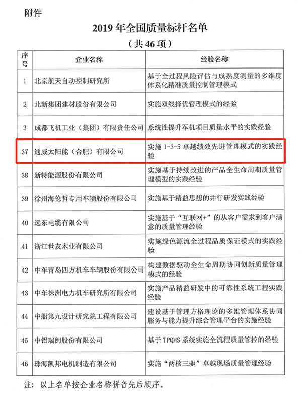 通威太陽(yáng)能合肥公司榮膺“2019年全國(guó)質(zhì)量標(biāo)桿”殊榮