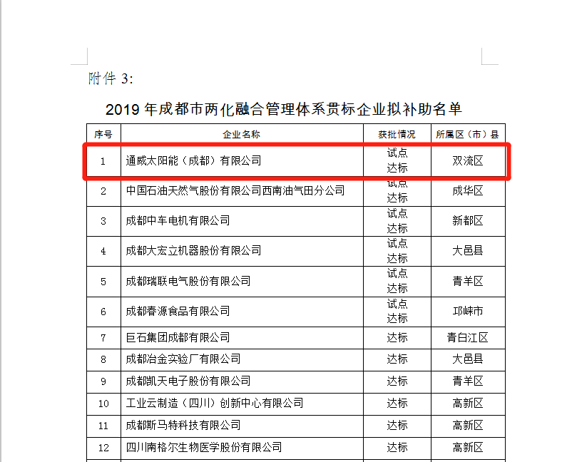 通威太陽能入列2019年成都市兩化融合管理體系貫標企業(yè)補助名單