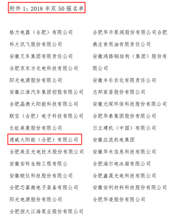 通威太陽能榮列“2018年度安徽省制造業綜合實力雙50強”榜單