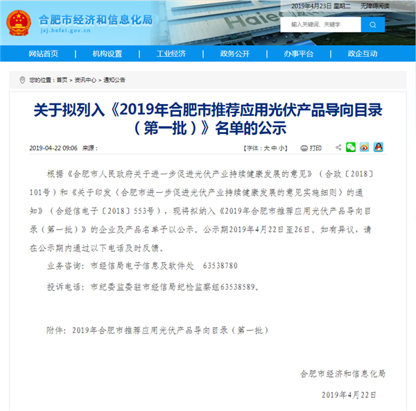 通威太陽能榮列合肥市推薦應用光伏產品導向目錄公示名單
