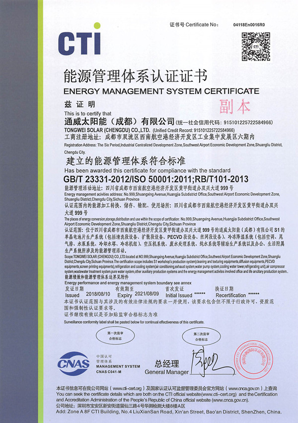 通威太陽能(成都)有限公司榮獲能源管理體系認證證書