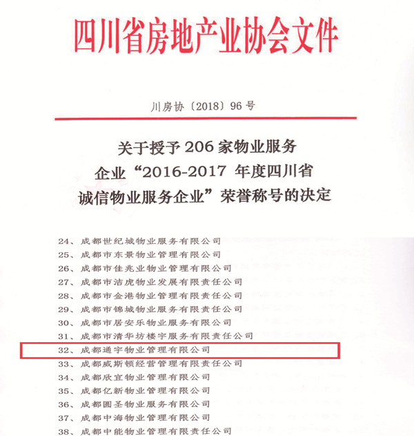 通宇物業榮獲四川省AAA級誠信物業服務企業榮譽稱號
