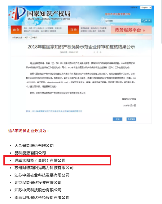 通威太陽能榮列2018年度國家知識產權優(yōu)勢示范企業(yè)公示名單