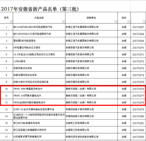通威太陽能(合肥)有限公司三項產品成功入列2017年安徽省新產品(第三批)榜單