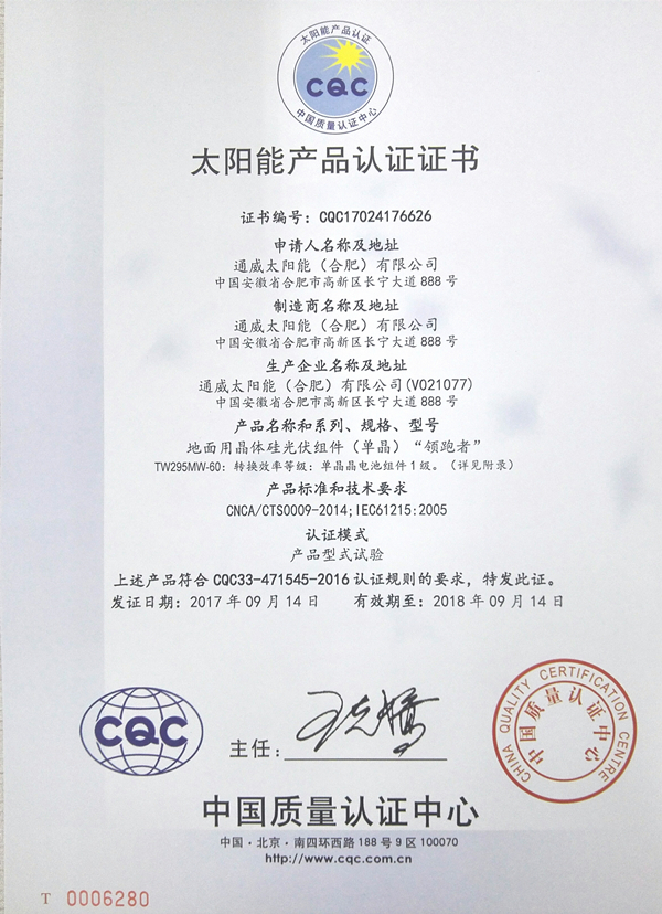 通威太陽能(合肥)有限公司榮獲地面用光伏組件“領跑者”認證