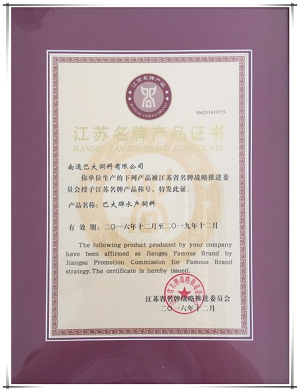 巴大牌水產飼料榮獲江蘇省名牌產品稱號