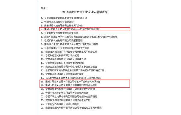 通威太陽(yáng)能(合肥)有限公司獲評(píng)“2016年度合肥市工業(yè)企業(yè)五星級(jí)班組”