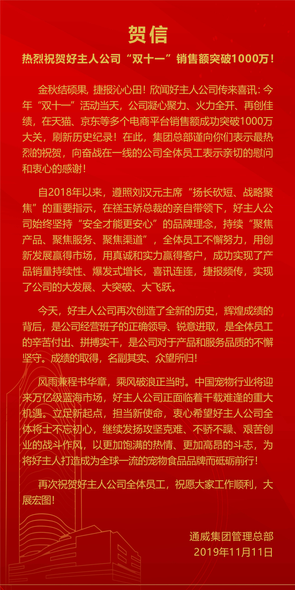 熱烈祝賀好主人公司“雙十一”銷售額突破1000萬!