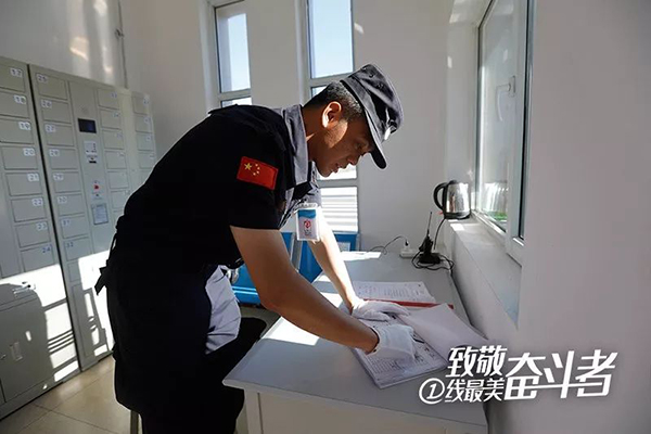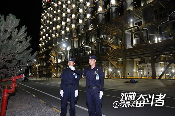 在2號門,魏志龍提醒執勤人員拿兩條毛巾,一起擦起了刻有廠名的墻壁,并叮囑他:“每天不要只擦一次,風沙大。”大門的衛生、車輛秩序,員工著裝規范都是他們的工作職責。看完各大門,魏志龍繼續巡查廠內重點區域,這種巡查會持續到晚上及凌晨夜班。基地面積800多畝,為了保證基地安全,物業秩序隊22人,每天24小時不間斷要巡邏7次,每天至少3萬步。