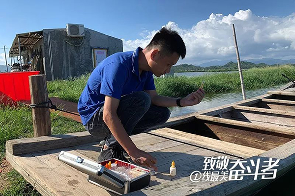 粵東8月的陽光與塘頭的暑氣令人眩暈,收蝦結束的時候臨近中午,我們跟隨朱俊杰在塘頭暴曬了兩個多小時,汗流浹背、頭皮發燙。下午3點,他又頂著烈日酷暑為客戶做測水實驗。
