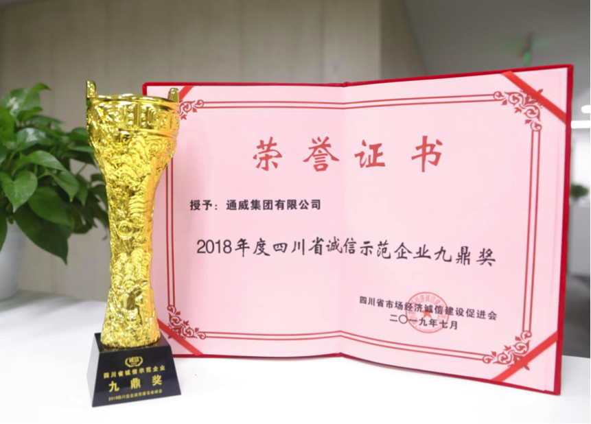 此次評選按照《四川省誠信示范企業評選管理辦法》要求,經省級有關部門、科研機構、大專院校專家嚴格評審,最終授予通威集團及通威旗下通威太陽能(成都)有限公司、四川永祥股份有限公司等738家企業“四川省誠信示范企業”稱號。此外,通威集團榮膺全場最重磅獎項“四川省誠信示范企業九鼎獎”,一同獲獎的還有四川省宜賓五糧液集團有限公司等8家四川知名企業。