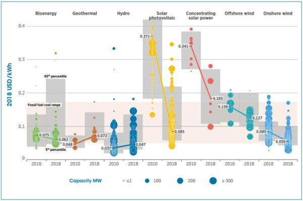 國際可再生能源署(IRENA)近日發(fā)布了最新版的可再生能源發(fā)電成本報(bào)告,報(bào)告數(shù)據(jù)顯示,2018年,全球所有商用可再生能源技術(shù)的發(fā)電成本均有不同程度下降,其中太陽能光熱發(fā)電(CSP)加權(quán)平均平準(zhǔn)化發(fā)電成本降幅最大,同比下降26%,生物質(zhì)能發(fā)電下降14%,太陽能光伏和陸上風(fēng)電下降13%,水電下降12%,地?zé)岚l(fā)電和海上風(fēng)電下降1%。