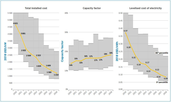 IRENA表示,這種加速趨勢由三個(gè)因素驅(qū)動(dòng)。首先,競爭性采購在降低發(fā)電成本方面發(fā)揮了很大的作用,因?yàn)樵谶^去,電力市場的安裝成本高于基準(zhǔn)的競爭性成本結(jié)構(gòu)。第二,人們越來越多的在陽光充足、容量系數(shù)較高的地區(qū)部署太陽能光伏發(fā)電。第三,太陽能光伏發(fā)電的融資成本下降。