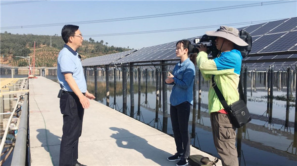 四川省水產技術推廣總站站長鄧紅兵在西昌“漁光一體”基地接受央視記者專訪