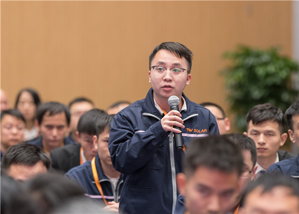 通威太陽能財務部部長宋梟、通威太陽能成都基地財務部部長助理盧明彬在會上作主題分享,他們結合自身實際案例,分享了自來到通威太陽能以來的工作感受和收獲。他們表示,在不到兩個月的時間,自己對太陽能公司、對自身崗位職責有了更深刻的認知,通過一個個親身經歷的案例,一次次深入一線的調研,對公司始終堅持直面市場挑戰不動搖、堅持自我批判不動搖、堅持每天進步1%不動搖的文化理念,和堅持貫徹問題導向、結果導向,真正想清楚并執行到位,堅韌、不服輸、永不放棄的拼搏精神有了更深刻的體會和感悟。
