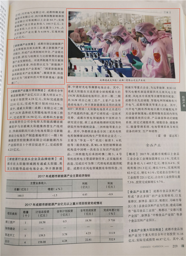 在2018年卷《成都年鑒》中,通威集團有限公司被列入2017年度“成都民營企業100強”和2017年度“成都制造業100強”。通威太陽能成都公司作為成都市新能源領域的行業龍頭企業在年鑒中被多次重點提及。年鑒中詳細介紹了通威太陽能項目進度、產能規模等情況,并以大畫幅刊登公司智能制造車間內生產畫面。