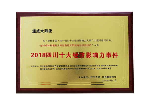 活動現場揭曉了“2018四川十大經濟影響力人物”、“2018四川十大經濟影響力事件”、“2018四川十大領軍企業”、“2018四川十大新經濟領軍人物”四大榜單,并舉行了“助推四川經濟高質量發展”論壇。歷經專家評審團近兩個月的審核、考察和市民投票環節,通威太陽能成都三期“全球單體規模最大高效晶硅太陽能電池項目投產”入選“2018四川十大經濟影響力事件”。