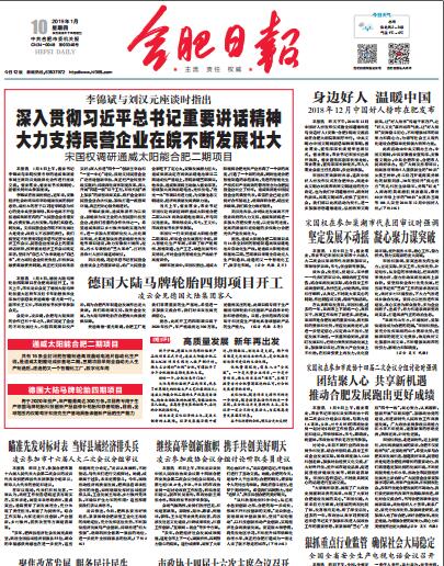 1月9日,《安徽日?qǐng)?bào)》在頭版推出題為《李錦斌與劉漢元座談時(shí)指出 深入貫徹習(xí)近平總書(shū)記重要講話精神 大力支持民營(yíng)企業(yè)在皖不斷發(fā)展壯大》報(bào)道,并指出,支持民營(yíng)企業(yè)在皖不斷發(fā)展壯大是黨委、政府義不容辭的責(zé)任。安徽將堅(jiān)定不移貫徹習(xí)近平總書(shū)記在中央經(jīng)濟(jì)工作會(huì)議、民營(yíng)企業(yè)座談會(huì)上的重要講話精神,積極解決融資難融資貴問(wèn)題,真正把支持政策落實(shí)好,希望通威以鄉(xiāng)村振興戰(zhàn)略實(shí)施為契機(jī),進(jìn)一步加大在皖研發(fā)投入、優(yōu)化項(xiàng)目布局,尤其是加快推進(jìn)新能源光伏發(fā)電等項(xiàng)目建設(shè),助力安徽農(nóng)村廁所、垃圾、污水專項(xiàng)整治“三大革命”,打好改善農(nóng)村人居環(huán)境這場(chǎng)硬仗。劉漢元主席表示,習(xí)近平總書(shū)記在民營(yíng)企業(yè)座談會(huì)上的重要講話,給廣大民營(yíng)企業(yè)家吃下了定心丸。安徽發(fā)展?jié)摿薮?,通威集團(tuán)將繼續(xù)加大高效晶硅電池、光伏發(fā)電、“漁光一體”等項(xiàng)目推進(jìn)力度,為安徽生態(tài)文明建設(shè)、經(jīng)濟(jì)高質(zhì)量發(fā)展貢獻(xiàn)力量。1月10日,《合肥日?qǐng)?bào)》、《合肥晚報(bào)》、《江淮晨報(bào)》也紛紛在重要位置推出了轉(zhuǎn)載報(bào)道。