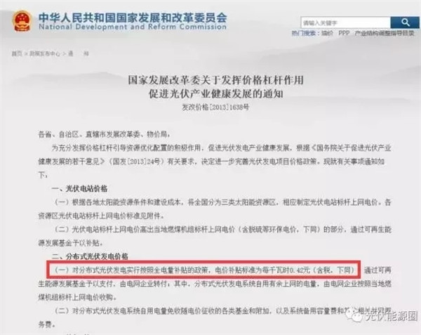2013年8月30日,國家發展改革委發布《關于發揮價格杠桿作用促進光伏產業健康發展的通知》,給予戶用光伏0.42元度電補貼。