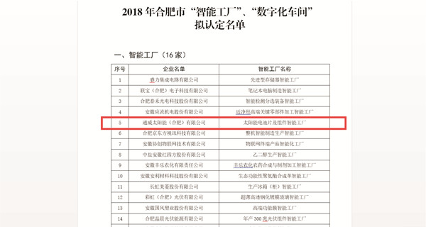 近日,合肥市經(jīng)濟(jì)和信息化委員會網(wǎng)站公示了2018年合肥市“智能工廠”、“數(shù)字化車間”擬認(rèn)定名單,通威太陽能(合肥)有限公司“太陽能電池片及組件智能工廠”榮列公示榜單,展現(xiàn)了公司在信息化和智能制造技術(shù)方面的高效應(yīng)用,同時也是對公司取得的自動化、信息化、智能化成果的充分肯定。