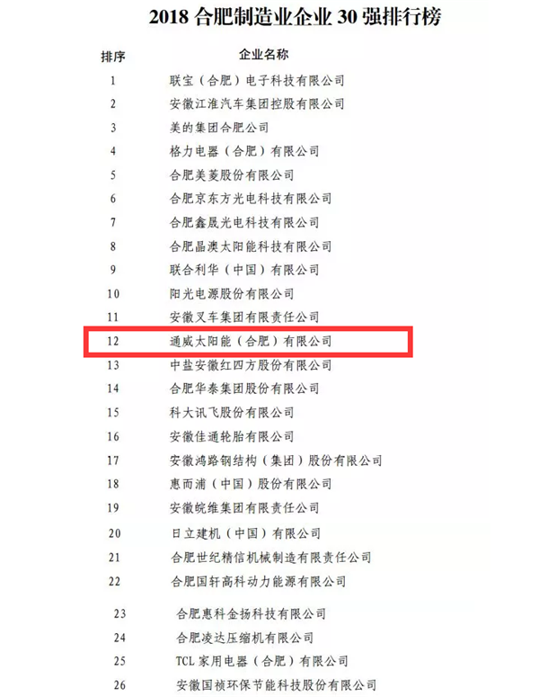 會(huì)議發(fā)布了2018合肥企業(yè)50強(qiáng)榜單、2018合肥制造業(yè)企業(yè)30強(qiáng)榜單、2018合肥服務(wù)業(yè)企業(yè)20強(qiáng)榜單、2018合肥建筑業(yè)企業(yè)20強(qiáng)榜單。通威太陽能合肥公司成功入選2018合肥企業(yè)50強(qiáng)榜單、2018合肥制造業(yè)企業(yè)30強(qiáng)榜單,分別從2017年第39位、第17位躍居第26位、第12位,通威太陽能合肥公司已連續(xù)多年入列雙強(qiáng)榜單,位次逐年攀升、增長(zhǎng)勢(shì)頭強(qiáng)勁。