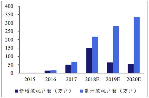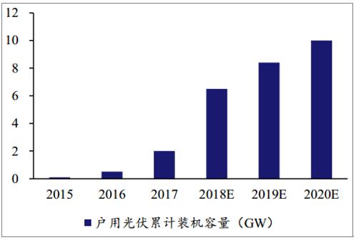 戶用光伏市場廣闊,未來大有可為。預(yù)計國內(nèi)有超過4000萬戶獨(dú)立屋頂,其中約有50%具備安裝戶用光伏系統(tǒng)的條件,假設(shè)每套裝機(jī)容量為5kW,那么裝機(jī)容量能夠達(dá)到100GW。如果具備安裝條件的屋頂中有 20%-50%安裝戶用光伏系統(tǒng),那么市場規(guī)模將達(dá)到3,200-8,000億元,而目前已經(jīng)開發(fā)的屋頂數(shù)量占比還不到5%,市場前景良好。2018年我國戶用光伏累計裝機(jī)量預(yù)計能夠達(dá)到6-8GW,預(yù)計2020年市場規(guī)模可以超過10GW。