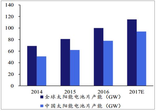 國內(nèi)規(guī)模再度創(chuàng)新高,分布式推動裝機(jī)持超預(yù)期。2017年中國光伏新增裝機(jī)53.06GW,創(chuàng)下歷史新高。主因分布式光伏快速發(fā)展,驅(qū)動行業(yè)裝機(jī)超預(yù)期。2017年光伏電站裝機(jī) 33.62GW,同比增加11%,而分布式光伏裝機(jī) 19.44GW,同比增長3.7倍,成為快速增長的細(xì)分領(lǐng)域。因中東部為負(fù)荷中心,無棄光消納問題,疊加脫硫脫硝電價較高,自發(fā)自用模式經(jīng)濟(jì)性凸顯,分布式光伏實(shí)現(xiàn)爆發(fā)式增長。