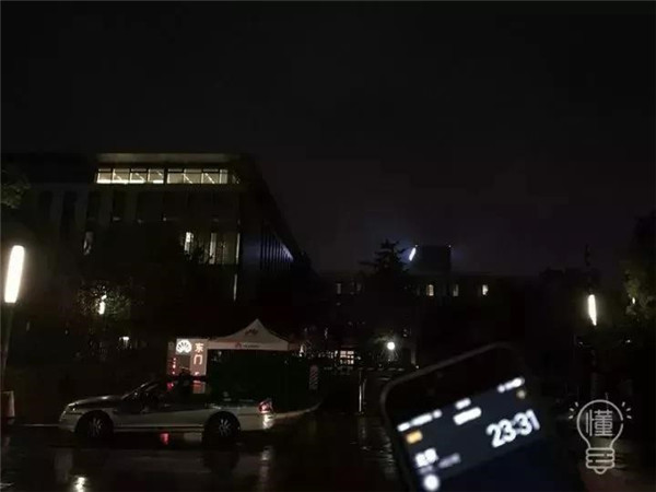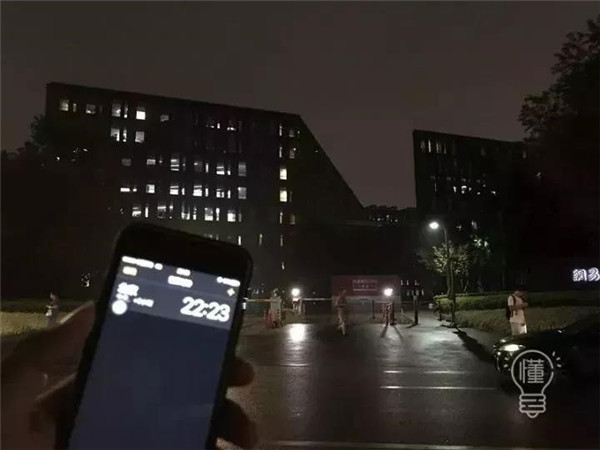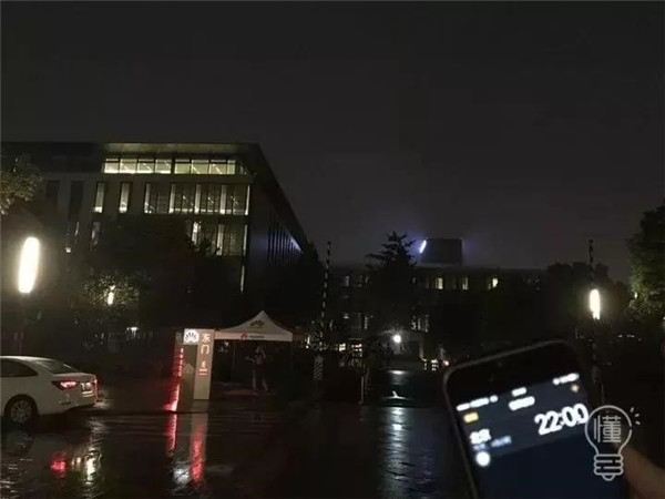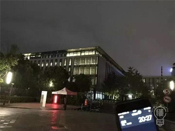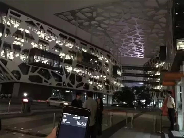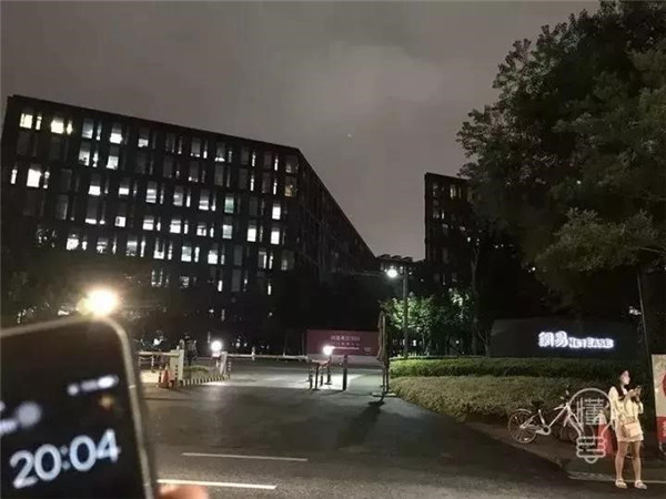 19:55-00:00的阿里巴巴蜂巢燈火通明,光彩耀人。19:56,阿里大門前只有寥寥幾人。