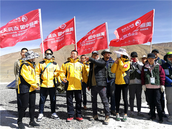 通威志愿者代表與楊欣會長在通威捐贈離網(wǎng)光伏發(fā)電系統(tǒng)的三江源驛站合影留念。