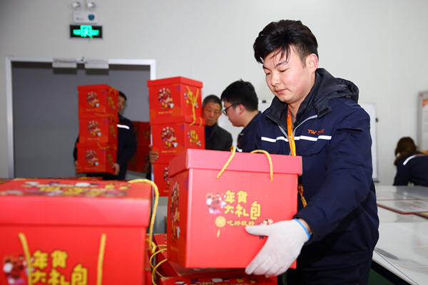 早在一個月前,兩地公司工會的工作人員便著手為全體員工采購新春禮品。當天一大早,滿載著“新春年貨”的貨車緩緩駛?cè)雰傻貜S區(qū),在工作人員的指引下,“派送小分隊”先后來到各生產(chǎn)車間及職能部門禮包派送指定地點,伴隨著大家的歡聲笑語以及新春祝福,將品種多樣的新春大禮包送到員工手中,讓全體員工在感受公司人文關(guān)懷的同時為家人送上一份豐厚的新春大禮。