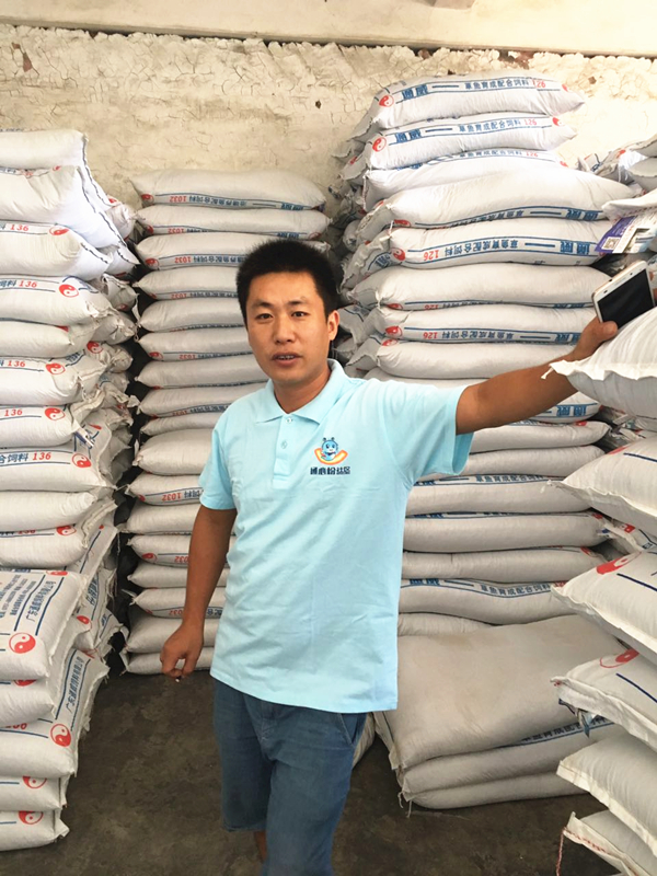 廖老板家碼放整齊的通威飼料