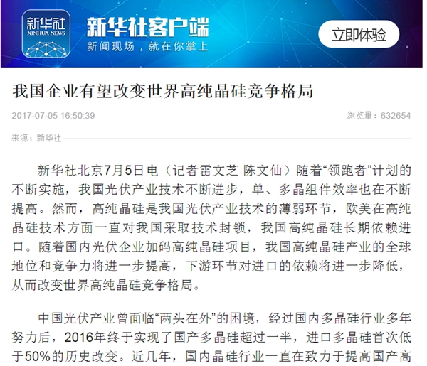 據(jù)新華社報道,隨著“領(lǐng)跑者”計劃的不斷實施,我國光伏產(chǎn)業(yè)技術(shù)不斷進步,單、多晶組件效率也在不斷提高。然而,高純晶硅是我國光伏產(chǎn)業(yè)技術(shù)的薄弱環(huán)節(jié),歐美在高純晶硅技術(shù)方面一直對我國采取技術(shù)封鎖,我國高純晶硅長期依賴進口。隨著國內(nèi)光伏企業(yè)加碼高純晶硅項目,我國高純晶硅產(chǎn)業(yè)的全球地位和競爭力將進一步提高,下游環(huán)節(jié)對進口的依賴將進一步降低,從而改變世界高純晶硅競爭格局。