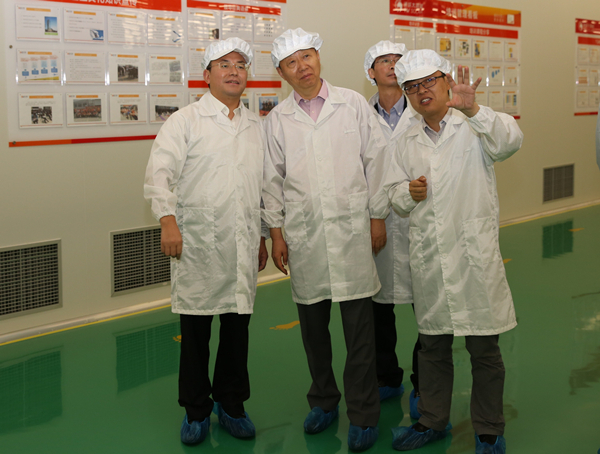 在黃總陪同下,錢曉明董事長參觀通威太陽能(成都)有限公司S1電池車間