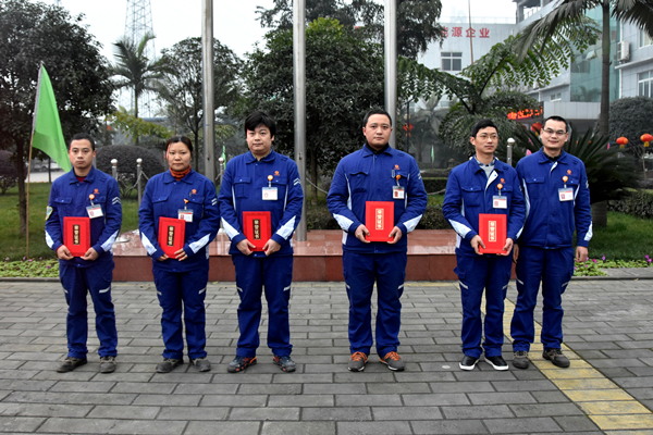 8點(diǎn)整,三名旗手邁著矯健的步伐走向旗臺(tái),五星紅旗及通威、永祥旗在莊嚴(yán)雄壯的國歌聲中冉冉升起,隨風(fēng)飄揚(yáng)。隨后,永祥多晶硅人事行政部經(jīng)理傅蘇宣讀了《2016年度優(yōu)秀團(tuán)隊(duì)及優(yōu)秀員工的通知》和《2016年度安全環(huán)保先進(jìn)評(píng)選結(jié)果的通報(bào)》,甘總等公司領(lǐng)導(dǎo)現(xiàn)場(chǎng)為優(yōu)秀團(tuán)隊(duì)及個(gè)人頒獎(jiǎng)。