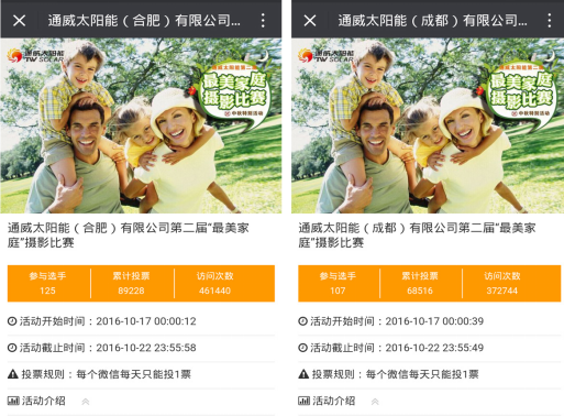 此次活動以通過微信朋友圈分享鏈接邀請親朋好友參與投票的方式,共計收到投票15萬次,頁面訪問量達83萬次,成為通威太陽能(合肥、成都)有限公司2016年企業文化活動中員工參與積極性和參與度最高的一次。