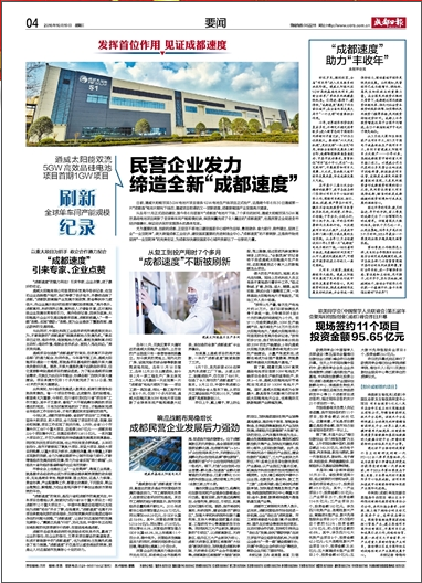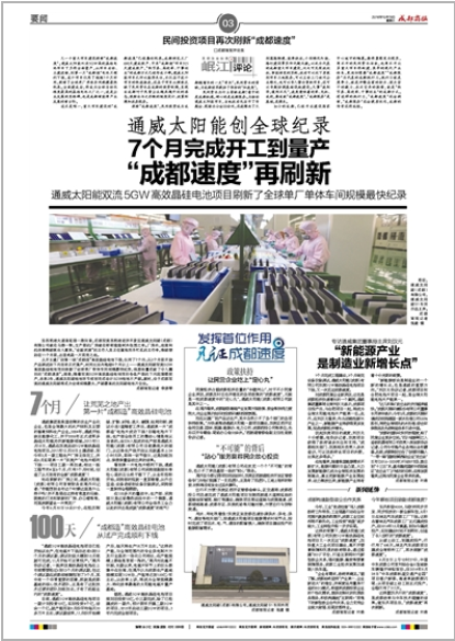 通威太陽(yáng)能雙流5GW高效晶硅電池項(xiàng)目從去年11月正式啟動(dòng)建設(shè),到今年6月30日第一片“成都造”電池片下線,7個(gè)多月的時(shí)間,通威太陽(yáng)能雙流5GW高效晶硅電池項(xiàng)目刷新了全球單車間產(chǎn)能規(guī)模紀(jì)錄,保質(zhì)保量完成了令人矚目的“成都速度”,成為民營(yíng)企業(yè)促進(jìn)地區(qū)經(jīng)濟(jì)穩(wěn)增長(zhǎng),保證經(jīng)濟(jì)良好發(fā)展勢(shì)頭的真實(shí)寫照。通威太陽(yáng)能(成都)有限公司取得的成績(jī)獲多家媒體點(diǎn)贊,登上各媒體新聞版面。