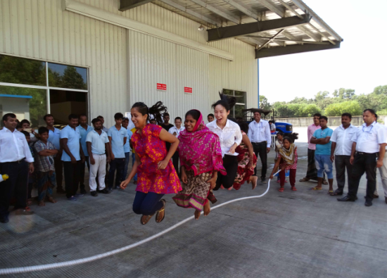 在“齊心協(xié)力”活動(dòng)中,六組選手背靠背用身體將氣球夾住,積極商討和主動(dòng)的配合口號(hào)聲很快就打破了最初的安靜,加油聲伴著歡笑。比賽分為個(gè)人賽和團(tuán)體賽。個(gè)人賽不光考驗(yàn)運(yùn)動(dòng)員的體力與技巧,還有領(lǐng)悟能力。團(tuán)體賽則體現(xiàn)出了孟加拉通威人的團(tuán)結(jié)與配合。這里不得不提女員工的表現(xiàn),平日里文靜的財(cái)務(wù)部出納因涼鞋影響發(fā)揮,索性赤腳上場(chǎng),觀眾們異口同聲的為她們計(jì)數(shù)“一、二、三、四……五十 !”女員工們節(jié)奏和速度明顯領(lǐng)先于其他隊(duì)伍,現(xiàn)場(chǎng)響起陣陣吶喊和助威聲。