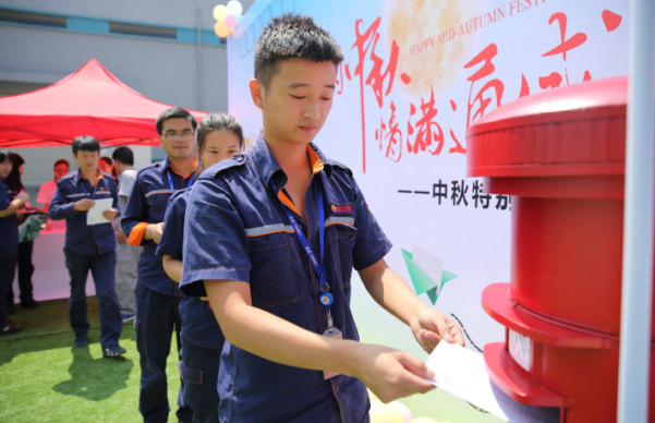 為能讓夜班員工也能充分參與活動,當天晚上合肥、成都兩地公司還將活動現場搬進生產車間。“很溫馨,本來以為夜班沒機會參與了,沒想到能將活動布置在車間。”年輕的陳俊是通威太陽能(合肥)有限公司電池二廠工藝部的管培生,即將迎來參加工作后的第一個中秋節,產線任務重,這個中秋沒法回家與家人團聚。“特地申請了兩張明信片,一份寄給在黑龍江的父母,一封寄給姐姐,給他們報平安,我在這里過得很好。”