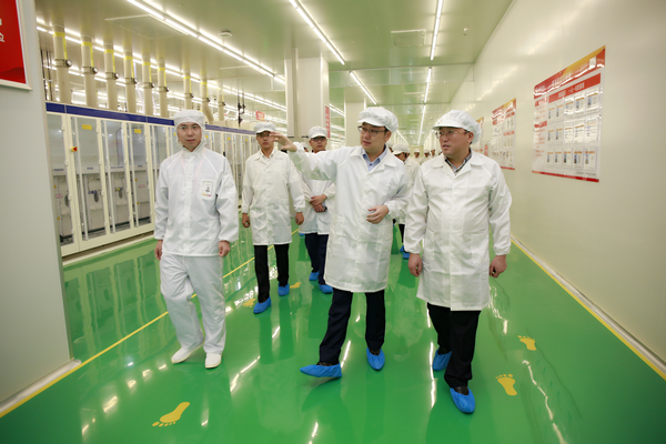 成區長一行首先來到通威太陽能(成都)有限公司參觀,在S1車間,通威太陽能(合肥、成都)有限公司董事長謝毅向成區長詳細介紹了公司目前產能情況及通威太陽能電池片生產制作工藝。參觀中,成區長對通威太陽能(成都)有限公司電池片生產車間制成工序的高度自動化給予了充分認可和高度贊賞。